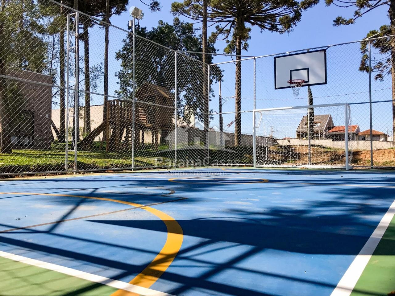 Condominio com portaria, salão de festas, quadra e área verde.